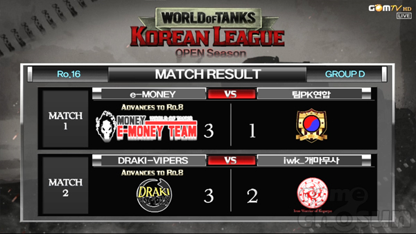 ... 비행장에서 펼쳐진 첫 경기e머니는 상대팀의T1 두 대를 잡아내며 유리한 고지를 점했고 이후 강행 돌파하는 적을 안전하게 막아내며 기분 좋은 출발을 했다. 2세트 힘멜스도르프에서 e머니와 팀PK연합은 별다른 교전 없이 무승부를 만들었으나이어진 재경기에선e머니가 패배하며 1대