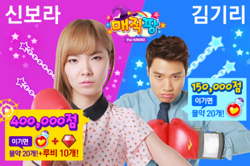 ... 총 3단계로 구성된 미션을 진행하면 다양한 게임아이템을 지급받을 수 있다. 퍼즐게임 ‘매직팡 for Kakao’에서는 ‘신보라와 김기리를 이겨라’ 이벤트를 진행한다. 혼자하기 모드를 통해 김기리와 신보라의 점수인 15만점, 40만점을 돌파한 이용자에게는 루비 10개가 제공