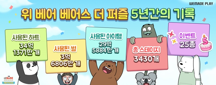 ... 한달 평균 5600만여 개, 하루 180만여 개가 사용된 하트는 하루에만 20만여 명이 즐기는 대중성과 함께 마니아층의 꾸준한 플레이, 콘텐츠 소비 결과로 풀이된다. 또한 퍼즐을 즐기며 곰 삼형제의 이야기 무대를 꾸미는 재료로 사용된 3억 6806만여 개의 별은 장르 결합형 모