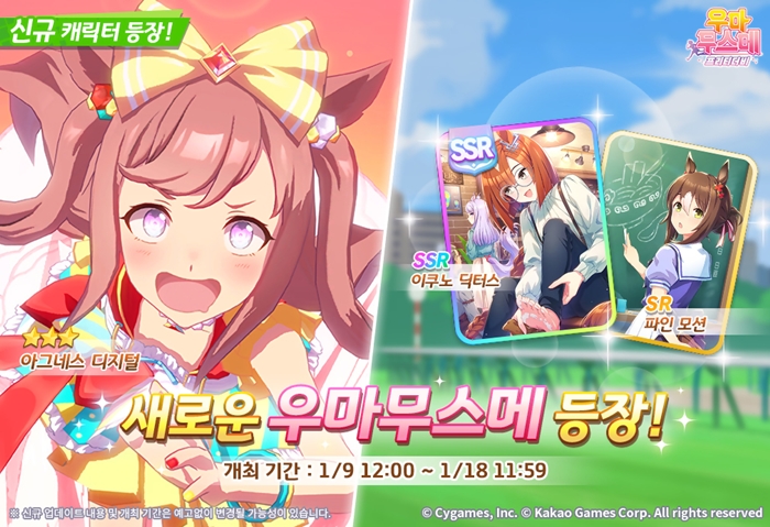 ... 하지만 선을 지킬 줄 알기에 다른 이들에게 피해를 주지는 않는다. 여러 우마무스메를 가까이에서 보고 싶다는 일념으로 잔디와 더트를 가리지 않는 만능 주력을 보여준다. 이와 함께, 서포트 카드 2종 ‘SSR [마음과 발은 따뜻하게] 이쿠노 딕터스’와