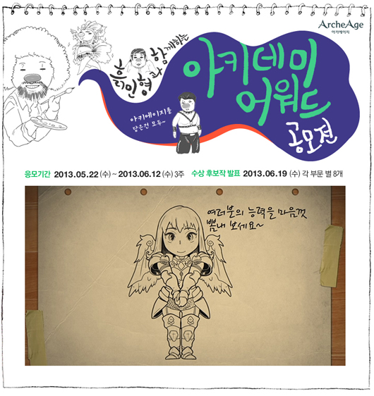... 컷 만화 부문은 게임 스크린샷 등을 배경으로 하고 말풍선으로 대사를 삽입한 두 컷 이상의 그림을 제출하고 팬아트 부문은 아키에이지 캐릭터 및 콘텐츠와 관련 있는 직접 그린 그림을 출품해야 한다. 꾸밈옷 디자인 부문은 게임에 실제로 적용 가능한 외형 복식을 디자인하는 것으로 회