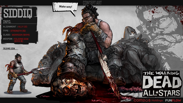 ... ‘워킹데드’ 코믹스 원작 캐릭터인 시딕은 우람한 외형으로 존재감을 과시한다. 각종 공사 도구를 무기로 활용하며 근거리 공격에 탁월한 능력을 지닌 것이 특징이다. 필살기로는 강한 힘으로 톱을 휘둘러 전방의 적에게 큰 피해를 입히는 절단 공격이 대표적이다
