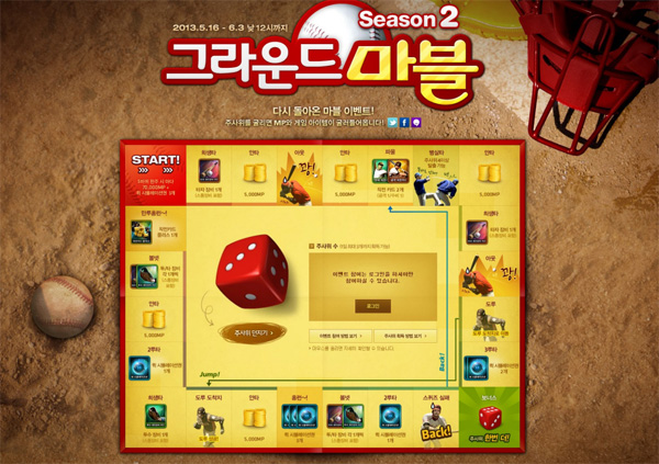 ... 단, 이벤트에 참여할 수 있는 주사위는 게임 플레이를통해서 얻을 수 있다. 말판의 칸은 희생타, 파울 등 야구 용어로 구성됐으며, 실제 야구처럼 홈런, 안타와 같이 점수를 낼 수 있는 칸에 도착해야 보상을 가져갈 수 있다. 또한, '도루' 칸이면 8칸 앞질러 가고, '병살타