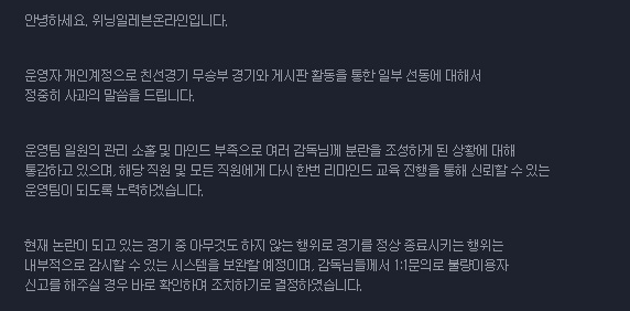 ... 더군다나 해당 운영자는 게시판을 통해 자신의 선수 자랑 및이벤트 홍보 등의 행위를 한 사실이 추가로 드러나며 논란은 가중됐다. 이로 인해 위닝일레븐온라인 자유게시판은해당 내용에 대한 진실 규명 및 운영자 아이디 색출에 관한이슈로 뜨겁게 달아올랐다. 결국 NHN한게임은 20일 위닝