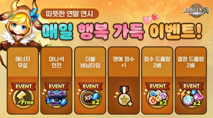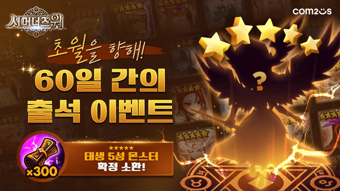 ... 이벤트 기간 동안 이용자들은 매일 1회 게임에 출석만 해도 초월의 소환서 조각 5개를 받을 수 있다. 60일 동안 꾸준한 출석을 통해 누적 조각 수 300개를 달성하면 태생 5성 불, 물, 바람 속성의 몬스터를 소환해 획득할 수 있다. 보너스 선물도 제공된다