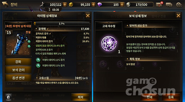 ... 보석은 하루에6번 입장해 공략할 수 있는'성역'에서 100% 획득할 수 있고 일반'모험 스테이지'에서낮은 확률로입수할 수 있다. 보석은 크게 무기 전용과 방어구 전용으로구분되며 여기에 등급은 아이템과 동일하게 일반-고급-희귀-영웅-고대-전설-불멸 등 7등급으로나뉜다. 보
