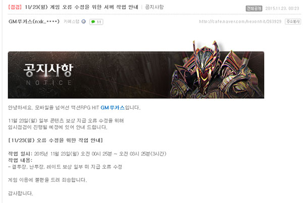 ... 이는 주 단위 게임 내 활동에 따라 보상이 지급되는 PVP와 레이드 콘텐츠에 대한 보상 지급에서 문제가 발생한 것으로 해당 공지글의 댓글에서 일부 유저들은 보상의 미지급 외에도 중복 지급이 발생했다고 주장했다. 23일 0시 45분 현재 댓글은 700개가 넘어선 상태고 해