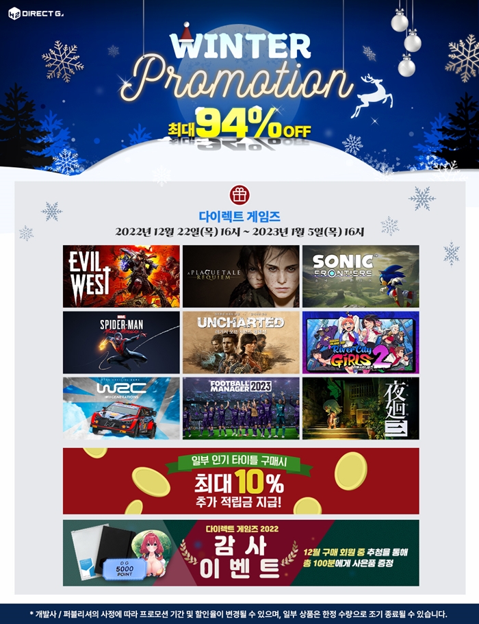... [자료제공 = H2 인터렉티브] 에이치투 인터렉티브(이하 H2 INTERACTIVE, 대표 허준하)는 디지털 유통 서비스인 다이렉트 게임즈에서 오늘(12월 22일)부터 겨울 할인 프로모션을 진행한다고 밝혔다. 다이렉트 게임즈에서 진행되는 이번 프로모션은 2022년 1