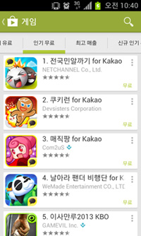 ... 지난 4월에는 상위 10개 게임 중 무려 8개가 모바일메신저인 카카오톡과 라인을 통해 론칭된 것으로 조사됐다. 지난 1월 톱10에 2개에 불과했던 카카오와 라인의 모바일게임은 2월과 3월 각각 5개와 6개로 늘었고 4월에는 퍼즐앤드래곤과 캔디크러시사가를 제외한 모든 자리를