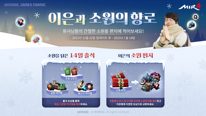 ... 출석일자에 따라 ‘용신기 감정서’, ‘희귀 빙정석’, ‘전설 마석 도전상자’, ‘영웅 신룡의 용신기 강화석’ 등 보상이 주어진다. 또한, ‘이은의 소원 편지’ 이벤트