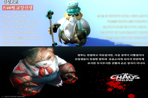 ...챈은 친근하고 인자한 할아버지 교장으로 등장해 과학, 체육, 미술 선생님의 모습을 넘나들며 다채로운 공격을 선보이며, 구르르 교장은 귀여운 테디베어의 모습을 하고 있지만 온몸에 선혈이 묻어있는 등 다소 섬뜩한 분위기를 자아내고 있다. 이와 함께초심자를 위한 '수련 대전'이라는 시스
