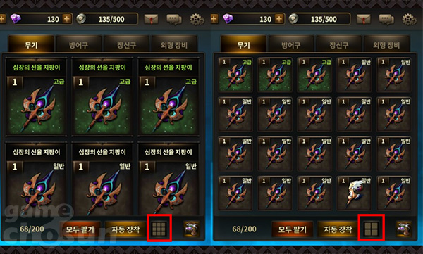 ... 히트에서는 상위 장비를을 얻기 위해서 기존 장비에 쓰지 않는 장비를 넣어 20레벨까지 강화한 후, 20레벨 장비끼리 합성시킨다. 때문에 장비칸에는 20레벨 까지 올리기 위해 소모되는 강화 재료용 장비와 다음 등급을 만들기 위한 합성용 장비가 섞이기 쉽상이며, 최종단계에 가서는