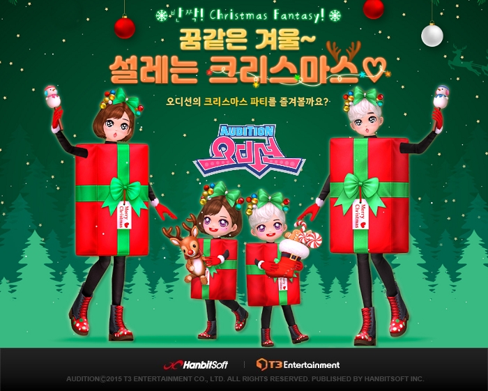 ... 이벤트 기간 중 유저들은 특별한 한정판 아바타 의상 패키지를 만나볼 수 있으며, 게임 플레이를 통해 한정판 아이템을, 주사위 미니게임을 통해 이벤트캐시를 획득할 수 있다. 2022년 12월29일 점검 전까지 기간 한정으로 선보이는 '크리스마스 산타패키지'는