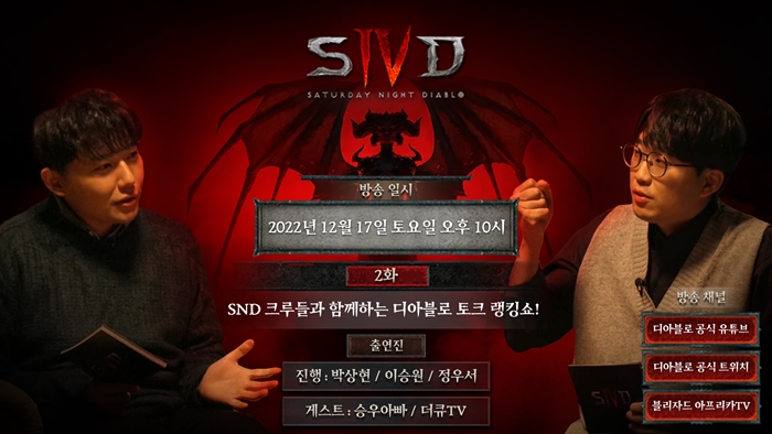 ... 디아블로 IV SND 1화는 지난 12월 9일 더 게임 어워드 2022(The Game Awards 2022)에서 진행된 디아블로 IV 공식 출시일 발표에 맞춰 방송된 바 있다. 이번 디아블로 특집 방송은 박상현 캐스터, 이승원 해설, 정우서 해설의 진행과 함께, 유튜버