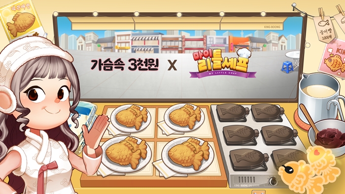 ... 먼저, 마이리틀셰프 내 오픈된 가슴속3천원 오브젝트 클릭 후, 가슴속3천원 앱을 통해 근처 붕어빵과 푸드트럭 방문을 공식 커뮤니티 카페에 인증한 유저 대상으로 마이리틀셰프 재화인 코니를 풍성하게 제공한다. 또한, 가슴속3천원 앱 내 현재 위치에 등장하는 노마 클릭 시 한정판 칭