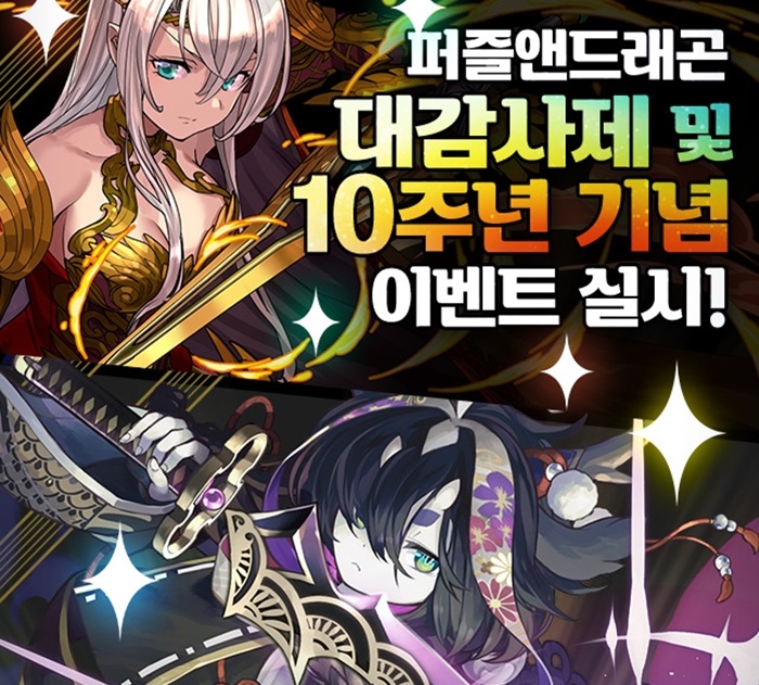 ... 또한 퍼즐앤드래곤 한국 서비스 10주년인 12월 10일부터 12월 31일까지 게임 접속 시 ‘마법석 100개’를 추가로 게임 내 메일로 받을 수 있다. 이번 대감사제 이벤트를 맞이해 12월 15일 12시부터 12월 19일 11시 59분까지 &lsquo