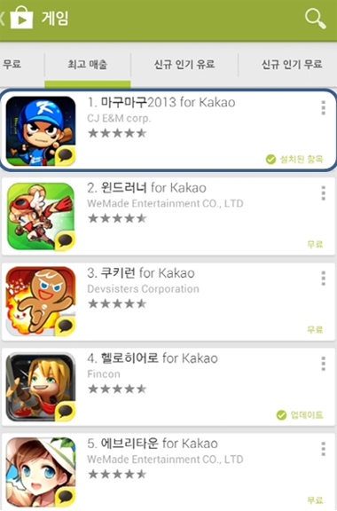 ... 이 게임은 온라인 야구게임 '마구마구'의 시스템을 기반으로 싱글 시즌∙배틀 대전∙홈런경쟁 등 다양한 게임모드를 구현한 것이 특징이다. 마구마구2013은 출시 3일 만에 구글플레이 신규 인기무료와 인기무료 2위에 각각 올랐고, 23일만인 지난 2일 최고매출 1위로 올라서며 모