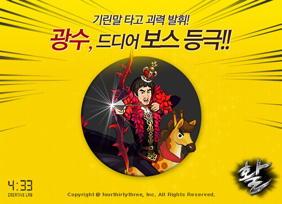 ... 활은 중력 센서를 이용한 실시간 대전 게임으로 출시 하루만에 앱스토어 1위, 2주만에 구글마켓 1위에 오른 바 있다. 회사측에 따르면 이번 업데이트에는 이광수를 캐릭터로 한 광수보스와 기린말이 등장해 재미를 더한다. 또한 이광수가 직접 녹음한 보스 음성이 지원되고 팀플레이