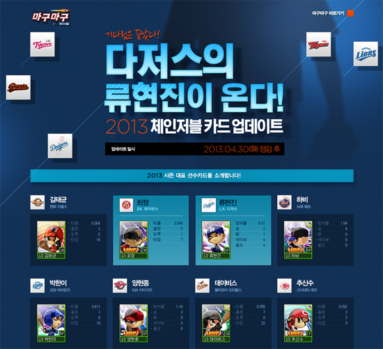 ... 2013년 체인저블카드는 KBO와 MLB 각 구단 선수들의 3월 30일부터 한 달간의 경기기록을 토대로 제작된 것으로 MLB에 진출한 LA다저스의 류현진과 최근 맹활약을 펼치고 있는 추신수 등을만나볼 수 있다. 또, 올해 자유계약선수(FA)로 새로운 유니폼을 입은 홍성흔(두