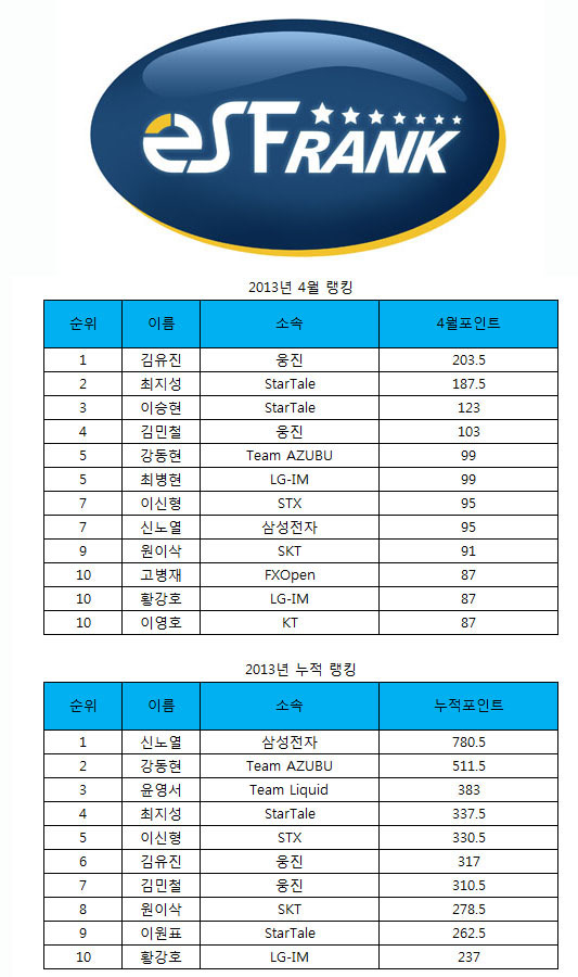 ... 김유진은 4월 마지막 날 진행된 GSL에서 16강전 두 경기를 모두 승리하며 8강에 동반 진출한 2위 최지성(스타테일)을 16포인트 차이로 앞서며 1위를 차지했다. 현재 최고의 저그로 각광받고 있는 이승현(스타테일)은 팀리그의 활약까지 더해지며 3위에, 웅진 김민철은 4위에
