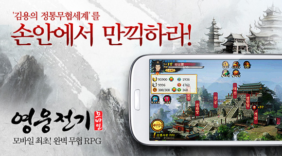 ... 영웅전기는 웹게임 '일대종사'의 모바일 버전으로 중국의 무협소설가 김용의 '영웅문' 시나리오를 수묵화풍 그래픽으로 녹여 낸 것이 특징이다. 이용자는 한 문파의 종사가 돼 무협소설 속 영웅들을 제자로 육성하고 최고의 문파로 키워나가게 된다. 특히 '화산논검'에서 진행되는
