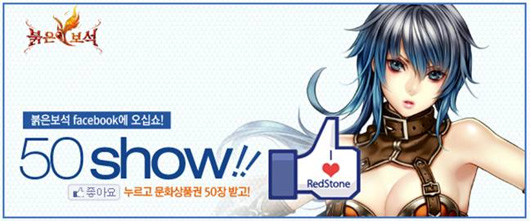 ... 기존 '붉은보석' 페이스북을 받아보던 이용자는 자동으로 응모되며 추첨을 통해 50명에게 문화상품권을 제공한다. 또 누적 ‘좋아요’ 수에 따른 이벤트도 진행된다. 5월 10일까지 붉은보석 페이스북 페이지에 누적된 수에 따라 5월 13일부터 2시간씩 최대 3일간 전서버에 경험