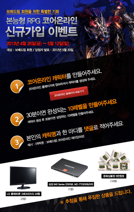 ... 이벤트 상품으로는 응모자를 대상으로 추첨을 통해 24인치 모니터, SSD, 문화상품권이 지급될 예정이다. '코어온라인' 개발사 엔트월은 "국내 최대 중고차 쇼핑몰이자 커뮤니티인 보배드림과 연계한 이벤트를 진행할 수 있어 기쁘게 생각한다"며 "본능적으로 즐기는 MMORPG '