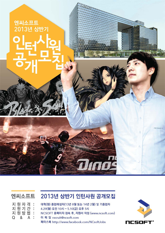 ... 지원서류는 오는 29일부터 5월 10일까지 엔씨소프트 홈페이지를 통해 접수하며 NC TEST(온라인 인성검사)와 면접을 거쳐 6월 21일 최종 합격자를 발표한다. 선발된 인턴사원은 7월 8일부터 8월 23일까지 근무하게 되며 우수인재에게는 장학혜택과 정규직 입사 기회를 제