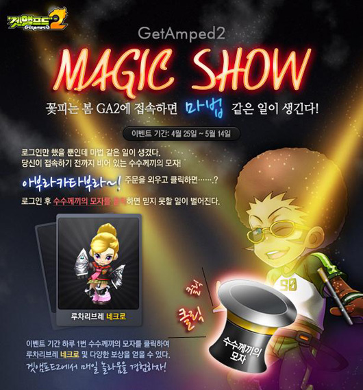 ... 윈디소프트(대표 백칠현)는 5월 어린이 달을 맞이해 자사가 서비스하는 '겟앰프드2'에 ‘매직쇼’ 이벤트를 진행한다고 26일 밝혔다. 내달 14일까지 진행되는 '겟앰프드2' 매직쇼 이벤트에서 이용자는 웹 로그인 시 ‘수수께끼의 모자’를 클릭하고 레어 액세서리 ‘루차리브레 네크