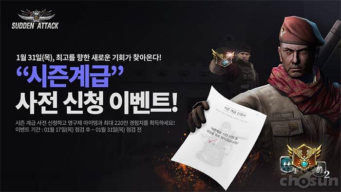 ...넥슨은 시즌계급 업데이트에 앞서 1월 31일까지 사전신청에 참여한 유저 전원에게 30만 경험치, ‘AK47(IK) Limited(영구제)’, ‘Scope AXE Limited(영구제)’를 즉시 제공하며, 사전신청 이벤트 종료 후 1,000 SP, ‘경험치 부스터 2. 0(15일)’