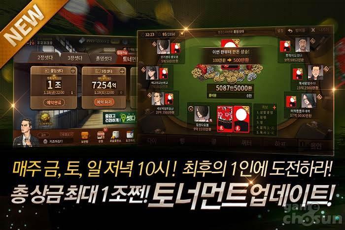 ...토너먼트 티켓은 일반 모드를 100판 플레이 할 경우 자동으로 획득할 수 있다. 토너먼트는 시작 3분 후부터 매 3분 경과 시 마다 베팅 시작 금액이 상승, 베팅 시작 금액보다 보유 환이 적을 시에 탈락하는 방식으로 진행된다. 매주 금요일, 토요일, 일요일 밤 10시에 각 각 홀