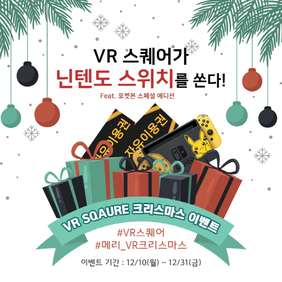 ...또한, ‘크리스마스 SNS 인증 이벤트’는 12월 10일부터 31일까지 진행되며, VR스퀘어 전 지점(홍대점, 일산점, 의정부점)에 해당된다. 이벤트 기간 동안 VR스퀘어를 이용하는 누구나 참여할 수 있다. VR스퀘어 매장에서 어트렉션을 이용하는 모습을 자유롭게 사진이나 동영상으