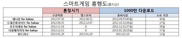 ... 지난 2012년 7월 애니팡으로 촉발된 모바일게임 신드롬은 숱한 히트작을 배출하면서 대한민국 게임의 역사를 새롭게 썼다. 특히 애니팡 이후 약 9개월 동안에만 드래곤플라이트, 모두의게임, 다함께차차차, 윈드러너까지 1000만 다운로드 돌파한 국민게임이 무려 5종이 배출되는