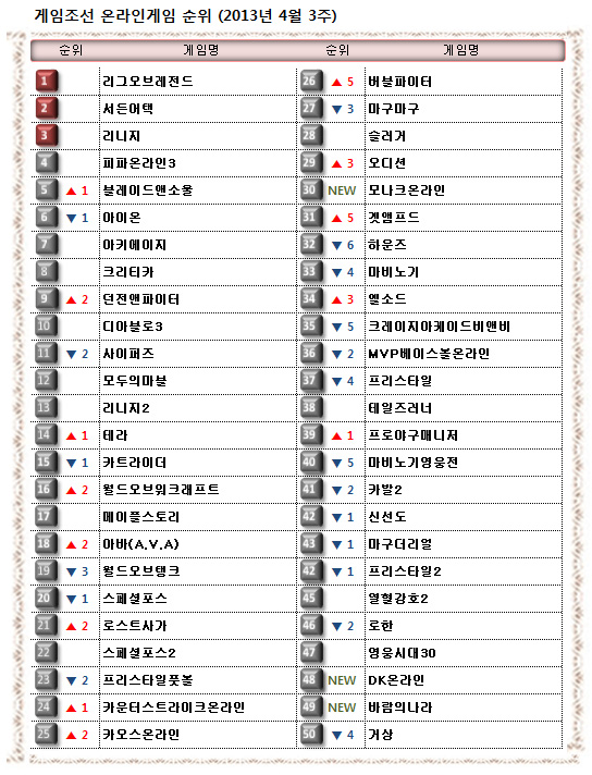 ... 4월셋째 주(2012년 4월 15일 ~ 2013년 4월 21일) 온라인게임 순위입니다. 지난 주 온라인게임을 살펴보면 신작 MMORPG '모나크'가 출시와 동시에좋은 성적을 기록하고 있는 가운데, '버블파이터'와 '오디션', '겟앰프드' 등 캐쥬얼 게임들의 강세가 이