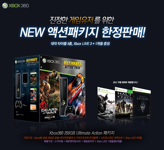 ... 또한 온라인 프로모션을 통해 '엘더스트롤5:스카이림' '배트맨 아캄시티' '헤일로:리치' 등 다운로드 콘텐츠(DLC) 3종과 Xbox 라이브 골드 멤버십 1개월 이용권 등을 추가로 획득할 수 있다. 해당 패키지의 가격은 39만 8천원으로 신세계몰, 옥션, 지마켓, 11번가,