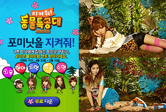 ... 지켜줘!동물특공대는 주인공 루루가 12종의 귀여운 동물친구들과 함께 위기에 처한 희귀 동물들을 구하는 내용을 담고 있는전략 어드벤처게임이다. 이번에 신곡 '이름이 뭐예요?'로 돌아온 포미닛 멤버들 역시 기존의 동물 친구들과 동일하게 각 스테이지별 감옥 안에 갇혀 있다.