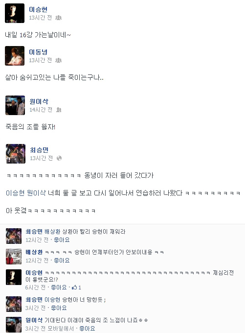 ... 3명의 우승자가 속해 죽음의 조로 불리는 G조에서 16강 진출을 앞두고 선수들이 페이스북에서도 심리전을 펼친 것. 스타테일 이승현은 자신의 페이스북에 “내일 16강 가는 날이네”라는 글을 게재하며 경쟁심을 부추겼다. 이동녕도도 중요한 대회를 앞두고 페이스북에 “살아 숨 쉬고