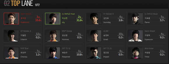 ... 이번 LOL 올스타전 한국대표 선발 투표는 ‘챔피언스 리그 스프링 2013’ 출전 선수들을 대상으로 펼쳐진다. 현재 지원, 정글, 중앙, 감독 부문은 높은 투표율로 1위를 유지하고 있다. 홍민기(매드라이프)는 지원 포지션에서 81