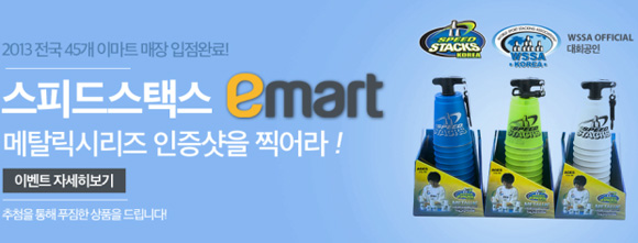 ... 이번 이마트에 입점하는 품목은 스피드스택스 메탈릭시리즈 3종(블루, 네온 옐로우, 화이트)으로 이마트를 통해 처음 선보인다. 현재 전국 45개 이마트 매장에 입점 완료했다. 생각투자에서는 내달 19일까지 이마트 입점 기념 이벤트를 실시하며 매장 진열대의 '스피드스택스'