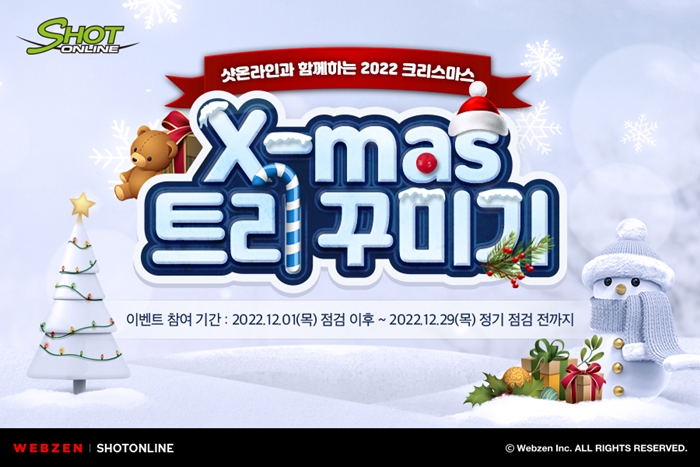 ... 이번 이벤트는 게임 내 이벤트에 참여하고 보상으로 획득한 크리스마스 장식 아이템 ‘크리스마스 전구’로 트리를 꾸미는 방식이다. ‘샷온라인’의 회원들은 게임 내 이벤트에서 획득한 ‘크리스마스 전구’를 NPC 캐