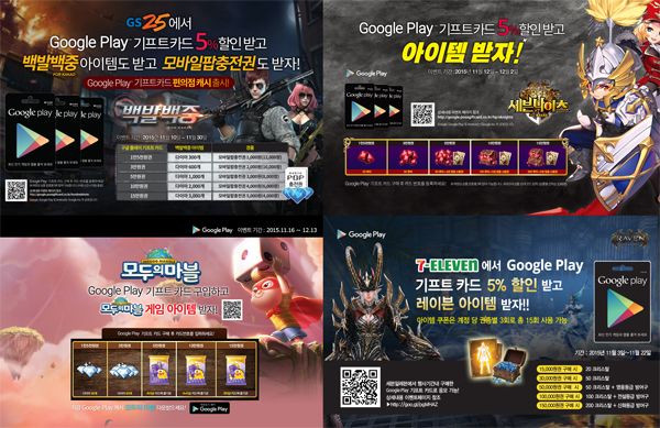 ... 5만원권 이상 구매자에게는 영웅~신화 등급의 방어구(레이븐)를 비롯해 4~6성 영웅 소환권(세븐나이츠), A~S이상 카드팩(모두의마블)을 제공한다. 백발백중의 경우 5만원권 이상 구매자에게 다이아 1000~3000개를 차등 지급한다. 참여방법은 구글플레이 기프트 카드에 기