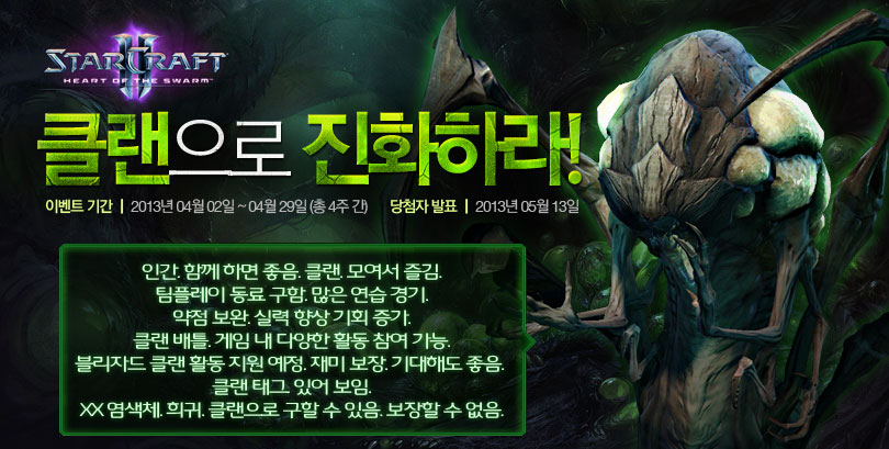 ... 이벤트 참여 대상자가 되기 위해서는 배틀넷에서 스타크래프트2에 접속해 ‘클랜 찾기’를 통해 클랜을 검색하거나 웹사이트에서 클랜을 찾을 수도 있으며, 클랜을 만든 후 본인의 클랜을 홍보해서 클랜원을 직접 모집할 수도 있다. 해당 이벤트는 추첨을 통해 맥북 에어 13’’, iPad