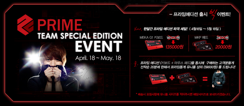 ...com)에서 프라임팀의 스페셜 에디션 키보드와 마우스패드를 한달 동안 할인된 가격에 판매한다. 이와 더불어 선착순 20분에 한하여 5만 9000원 상당의 프라임 동계 유니폼 상의를 상품으로 지급한다. ]이번 프라임팀 에디션으로 제작된 ‘MEKA G1 프라임 에디션’ 키보드는 제작