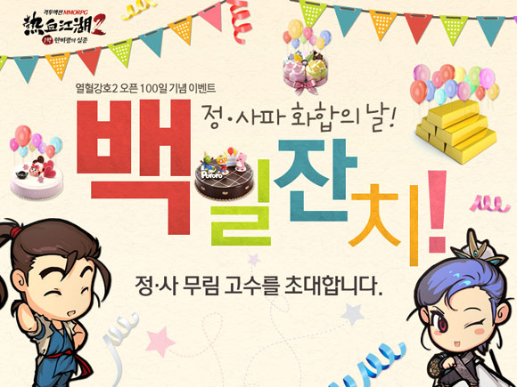 ... 엠게임은 지난 3개월 간 '열혈강호2' 회원들이 보내준 성원에 감사하는 마음을 전하고자 정파와 사파의 정예 고수 30여 명을 초청하는 '백일잔치'를 마련했다. 이번 '백일잔치'는 '열혈강호2' 공개서비스 이후 유저들이 공식적으로 만나게 되는 첫 오프라인 모임이다. '백일