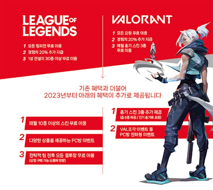 ... 이번 발표를 통해 LoL, 발로란트 등 라이엇 게임즈의 다양한 게임이 프리미엄 PC방 이용자를 위한 혜택을 강화한다. 226주 연속 PC방 점유율 순위 1위를 유지 중인 LoL은 ▲매월 10종의 스킨을 상시제공하고 ▲다양한 상품을 제공하는 PC방 전용 이벤트를 주기