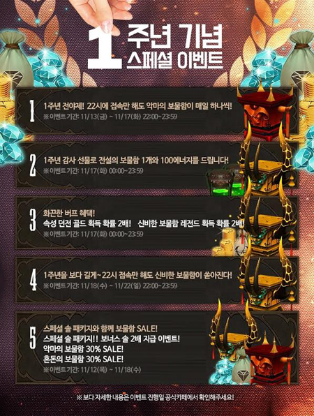 ...우선 당일에는 접속하는 모든 유저들에게 ‘전설의 보물함’과 ‘100 에너지’를 제공하는 ‘1주년 감사 선물 이벤트’를 진행한다. 더불어 18일부터 22일까지는 매일 지정된 시간에 접속하는 유저들에게 ‘신비한 보물함(최대 5개)’을 제공한다. 이 외에 ‘1주년 기념 출석 체크 이