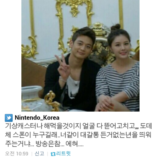 ... 하지만 개인이 아닌 기업에서 이런 댓글을 달았다면 문제는 더욱 심각해진다. 실제로 사회적 책임을 안고 있는 한 기업이 연예인을 비방하는 댓글을 달아 눈길을 끌었다. 한국닌텐도는 15일 인터넷 신문 매체인 TV리포트에서 보도한 '박은지, 민호와 다정샷 공개'란 제목의 기사에