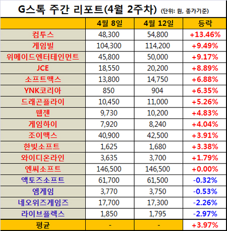 ... 게임빌은 최근 1주일간 9. 49% 오르면서 11만4200원에 거래를 마쳤다. 3월말 9만원대였던 주가가 어느새 11만원대를 넘어섰다