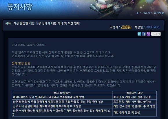 ... 최근 발생한 서버 장애에 대해서 라이엇게임즈는 쾌적한 게임 환경을 제공하기 위해 인프라 구축을 진행했으나 작업과정에서 예기치 못한 문제들이 발생했다고 밝혔다. 이에 라이엇게임즈는 서버 관리 인력을 총동원해 조치를 진행 했으며, 브랜든 벡 CEO를 포함한 본사 경영진들도 한국