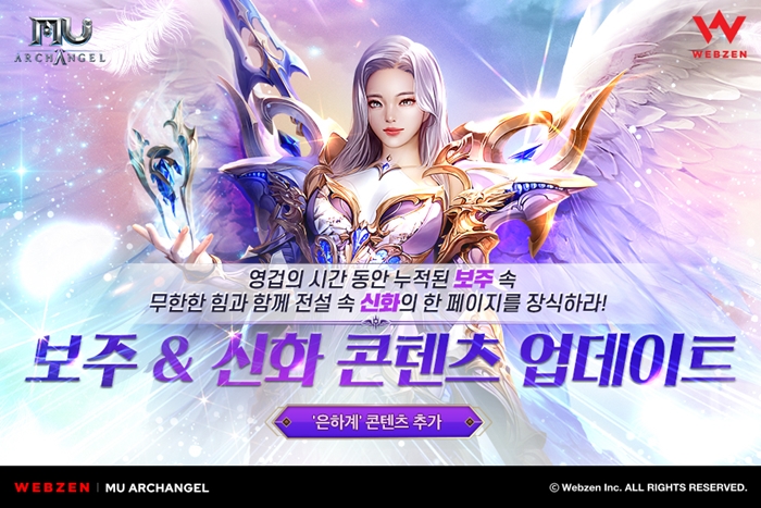 ... 웹젠은 오늘(11월 22일) ‘뮤 아크엔젤’의 캐릭터에게 무한한 힘을 선사할 보주, 신화, 은하계 총 세 가지 콘텐츠를 추가한다. 게임 내 마스터 500레벨을 달성하면 '보주'와 '신화' 기능이 열린다. 보주는 총